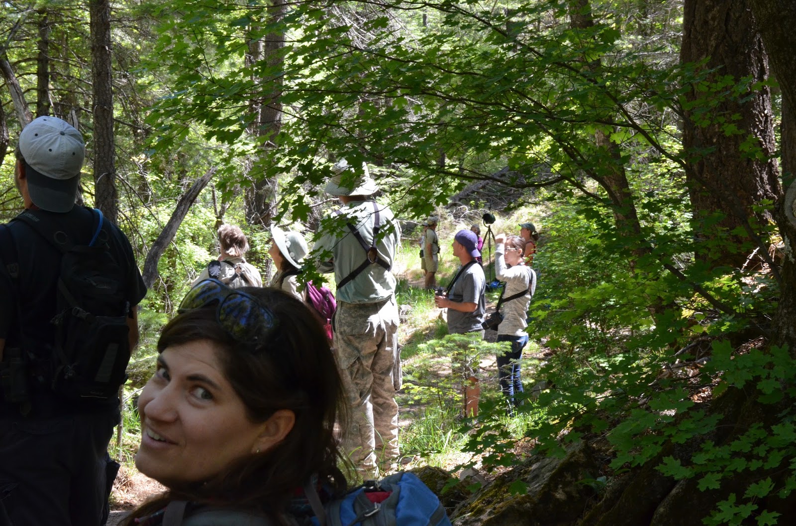 Since the report came in on Friday, through a series of several text messages, 4 of us planned a crazy trip to head to Ramsey Canyon on Saturday to try our luck at locating this bird as it would be lifer for all 4 of us. I met up with Magill Weber and Tommy DeBardeleben very early on Saturday morning and we headed to Tucson and met up with Chris Rohrer to chase this bird. Since we arrived in the area almost an hour earlier than Ramsey Canyon's Visitor Center opened, we opted to drive to the campground at the end of Carr Canyon and then walk down the back way. I have never been to either one of these places before but after this trip, I know I want to check them out sometime in the future. This is absolutely stunning scenery and the birds were awesome and numerous. However our objective was the Tufted Flycatcher so we focused on getting to the spot where it had been seen the day before. An awesome 3 mile hike later and we came upon the spot and it was not hard to find as you can see by the following photos that others arrived before we did. Guess it was a popular spot in this very remote area that day! Gives you an idea how special this bird is.
